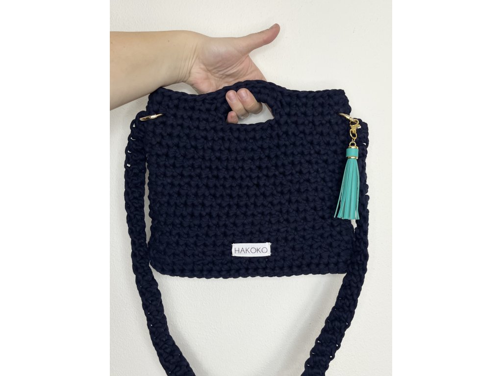 Ručně háčkovaná z kvalitní bavlněné příze v hlubokém tmavě modrém odstínu drží tvar, když potřebujete mít věci pod kontrolou, ale zároveň zůstává poddajná a příjemná na nošení, když se den vyvine jinak, než jste plánovaly.